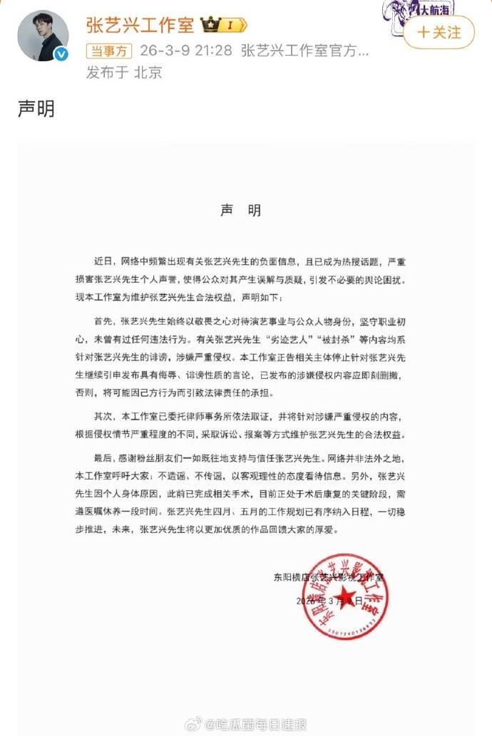 3月9日深夜,张艺兴工作室一纸声明在网络掀起波澜。这份不足500字的文件里,团队不仅否认了“被封杀”“劣迹艺人”等传言,还直接甩出律师函警告——“已委托律所依法取证”。可就在三天前,某社交平台上“张艺兴被国家话剧院除名”的话题阅读量已破8亿,#张艺兴滚出娱乐圈#的词条更是在热搜榜挂了整整18小时。从顶流偶像到“劣迹艺人”,这场舆论风暴来得比长沙的暴雨还突然。
